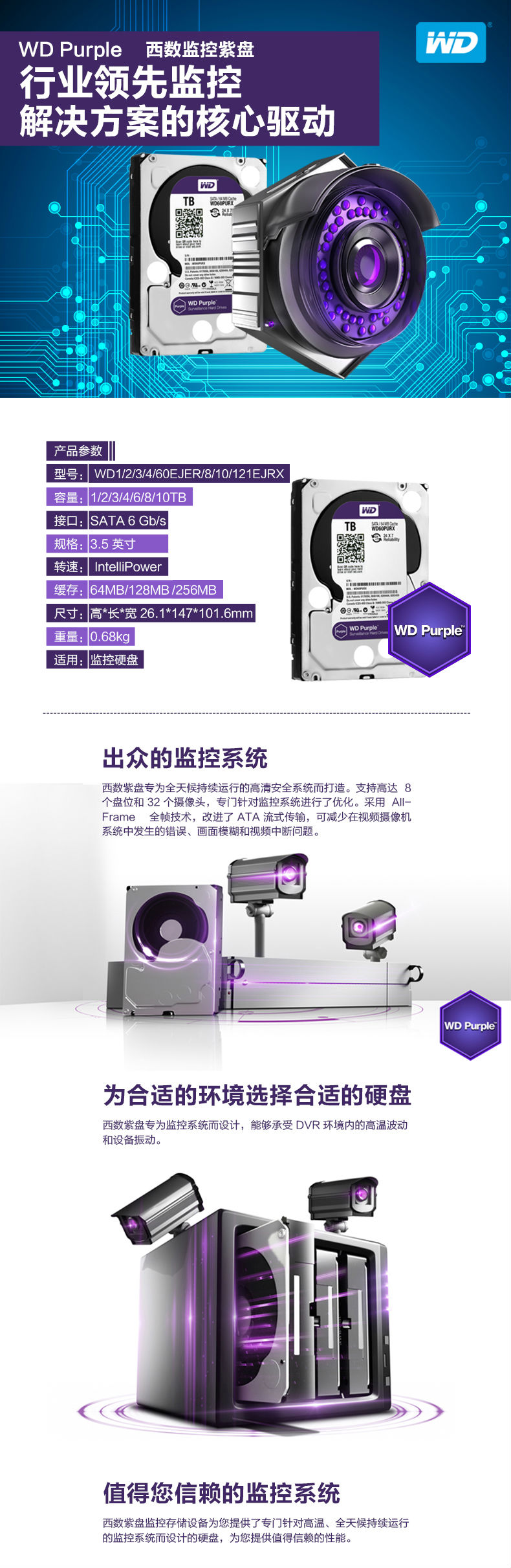 WD/西部数据监控机械硬盘1t2t3t4t6t8t10t12t14t紫盘WD10EJRX WD20EJRX WD40EJRX WD60EJRXWD82EJRXWD140EJRX